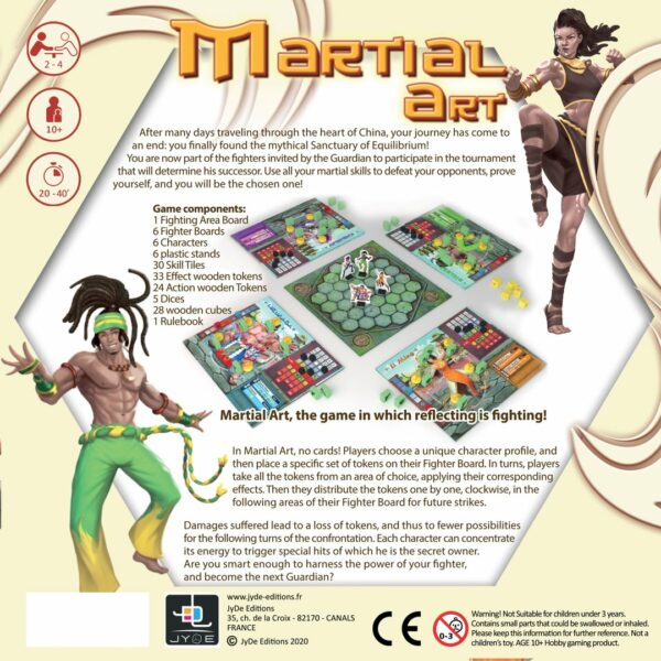 Dans Martial Art, pas de cartes ! Les joueurs choisissent un Personnage au profil unique puis disposent un set de pions spécifique sur leur Plateau Combattant. Tour à tour, ils prennent tous les pions d'une zone et en appliquent les effets. Puis, ils distribuent les pions un par un, dans le sens horaire, dans les zones suivantes de leur Plateau Combattant pour les prochaines attaques. Les dégâts subis impliquent une perte de pion et donc moins de possibilités pour la suite de l'affrontement. Chaque personnage peut concentrer son énergie pour déclencher des coups spéciaux dont il est le seul à avoir le secret.