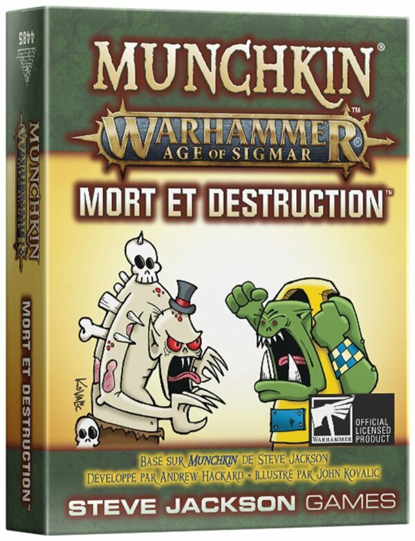 Le jeu de société Munchkin : Warhammer Age Of Sigmar - Mort Et Destruction vous plonge dans un univers fantastique où les cannibales des Flesh-Eaters et les fous furieux des Ironjaws s'affrontent dans une bataille sans merci.