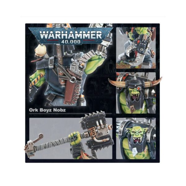 Ce kit permet d'assembler 5 Boyz orks équipés d'un kalibr' et kikoup', 3 d'un fling', 1 d'une arme spéciale, et 1 Boss Nob pour les diriger. Les options d'arme spéciale pour un ork consistent en plus de dakka grâce à un gros fling', ou des gros boums avec un lance-rokettes, tandis que le Boss Nob peut avoir une tête casquée ou non, et une méchante pince énergétik' ou un gros kikoup'.